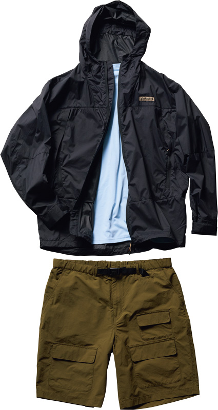 Tシャツ&短パンの定番スタイルには、軽量で持ち運びしやすいウインドシェルジャケットを一枚プラスしよう。デイリーユースならワンサイズ上を選ぶのもありだ。ポケット多めのショートパンツは、レギュラーフィットで動きやすい。