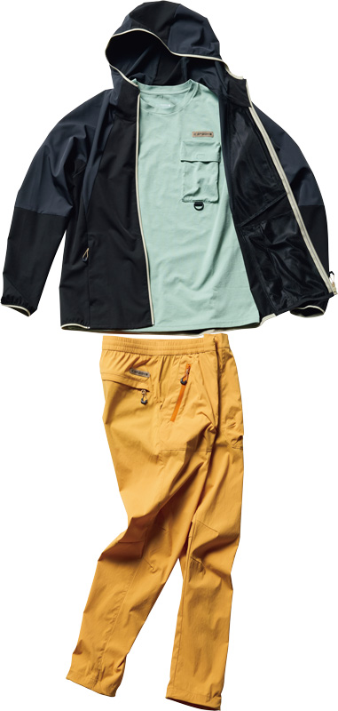春先や夏の高山におすすめ、柔らかなジャージ素材をミッドレイヤーに据えたコーディネート。ジャケットの肌面はさらりとした感触なので、脱ぎ着がスムーズ。パンツはソフトシェル素材。ストレッチ性があるので足上げもストレスフリー。
