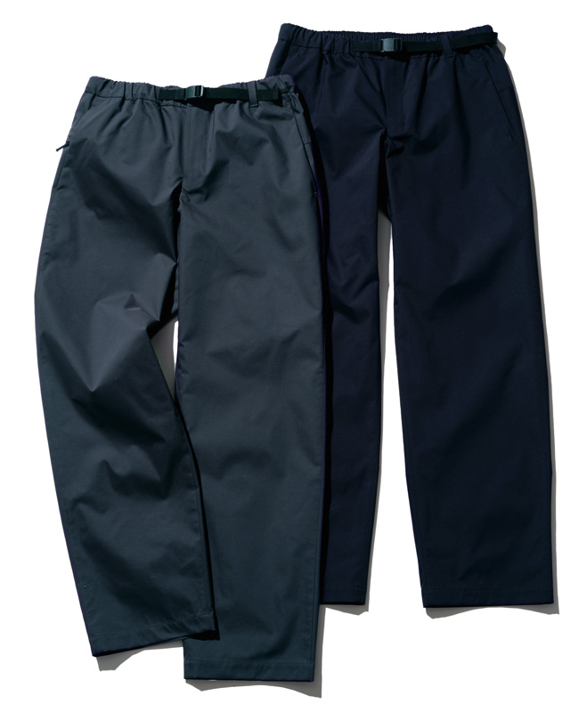 なかでも好評なのが、オリジナルパターン設計で仕上げたトレッキングパンツ。歩きやすさを追求して富山のテックラボで検証を重ねた。ヒップから太ももにかけてはややゆとりをもたせ、裾に向かって緩やかにテーパード。このシルエットが完成するまでに何パターンも作成し、実際に足上げ動作の検証を重ねたという。人間が片ヒザを上げたとき、尻から太ももにかけて皮膚が約17cm伸びるといわれる。そんな人間工学に基づいて細やかにデザインされた一本だ。また、それだけでなくスラックスのように立ち姿がきれいなシルエットも追求しているところがポイント。
