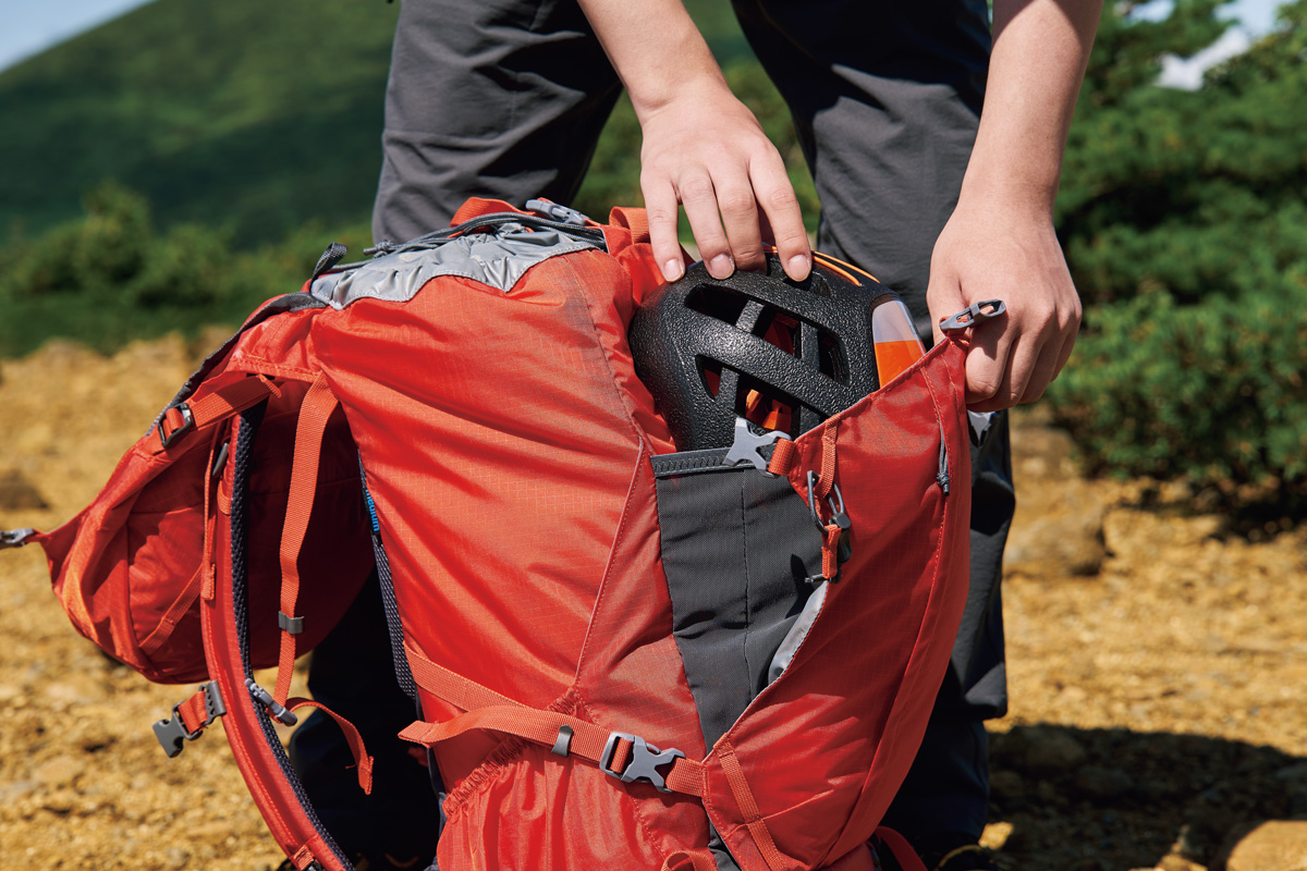 フロントポケットはストレッチ素材のマチ付きで、収納時は膨らみ、未使用時はフラットに。ヘルメットもすっきり収まる。