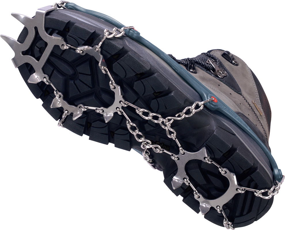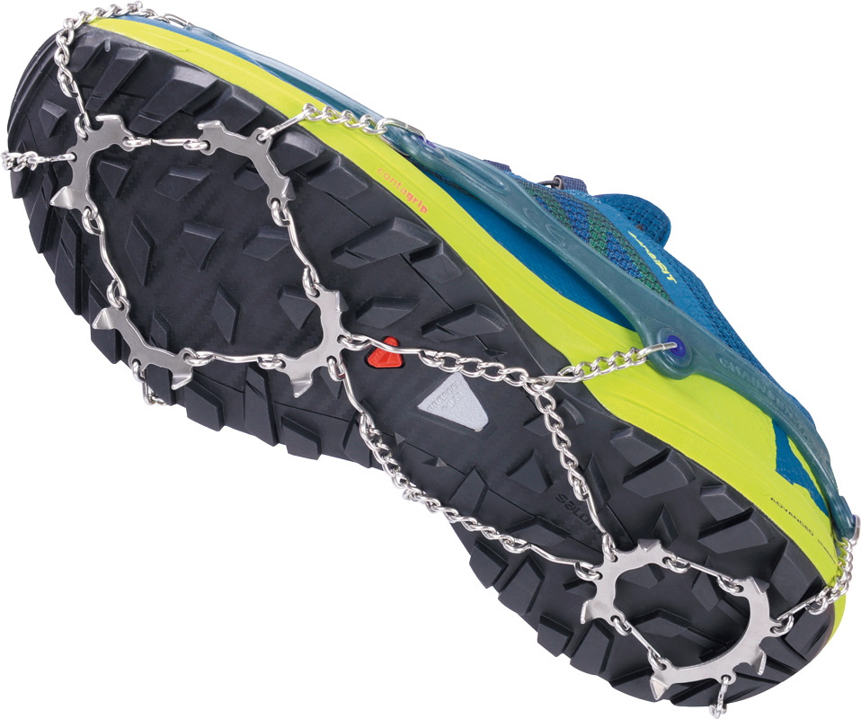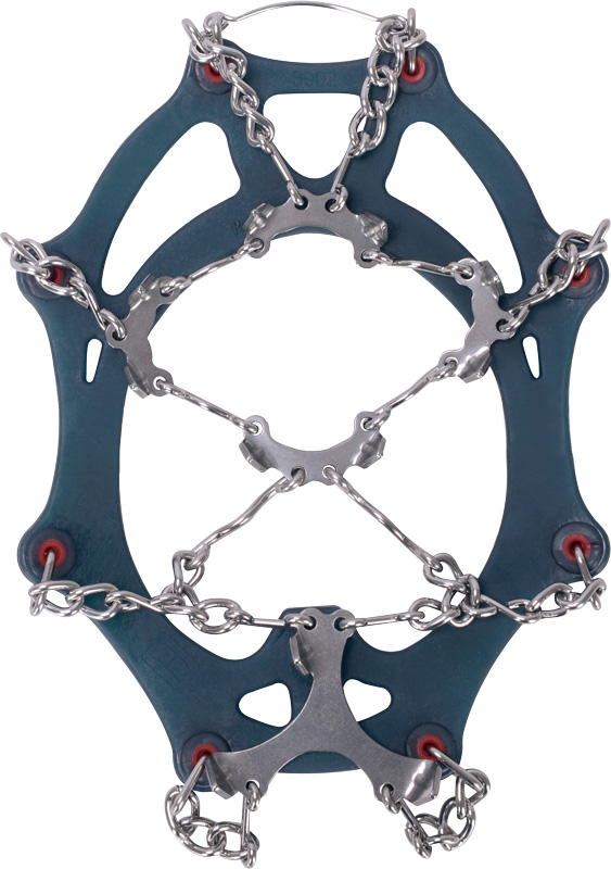 2㎜厚高強度ステンレス製の爪を2.5㎜径のステンレスチェーンで繋いだ堅牢性の高いモデル。荒れた道でも爪が曲がったりチェーンが切れたりする心配がない。氷結路はもちろん、濡れて滑りやすい路面でもしっかりグリップする11本爪(Sサイズは8本爪)仕様。極寒環境でも性能を存分に発揮し、着脱も容易だ。
