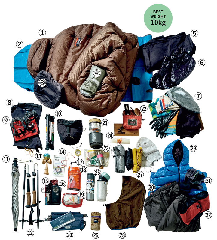①寝袋 ナンガ/オーロラライト450DX ②スリーピングマット クライミット/イナーシャオゾン ③枕 シートゥサミット/エアロプレミアムピロー ④寝袋カバー SOL/エスケープヴィヴィ ⑤インナーシーツ スタティック/アドリフトライナー ⑥ダウンソックス ライトウェイ/クーニーエーペックス+4℃ ⑦着替え・防寒具 ⑧ゲイター フリーライト/キャハンR ULゲイター ⑨チェーンスパイク ブラックダイヤモンド/アクセススパイクトラクションディバイス ⑩カメラ・三脚 ライカ/Mtyp240、ベルボン/UT-3AR、マタドール/カメラベースレイヤー2.0 ⑪傘 シックスムーンデザインズ/シルバーシャドウ ⑫ポール ブラックダイヤモンド/アルパインFLZ ⑬けん玉 ウシケンダマ/すまいるん ⑭地図とコンパス シルバコンパス/フィールド37501 ⑮ヘッドランプ&ライト ペツル/ビンディ、ゴールゼロ/ライトハウスマイクロフラッシュ ⑯モバイルバッテリー アンカー/パワーコアエッセンシャル20000 ⑰温度計 エンペックス/サーモマックス50 ⑱エマージェンシーシート SOL/エマージェンシーブランケット ⑲ファーストエイドキット エクスペド/クリアキューブファーストエイドS ⑳トイレキット モンベル/O.D.トイレキット、O.D.ガベッジバッグ ㉑火器・クッカー ジェットボイル/スタッシュ、トークス/チタニウムポット550ウィズアウトハンドル、コジー/MYOG(byブラックスミスハイカー) ㉒カトラリー ヌルク/ノワレ、バーゴ/チタニウムチョップスティック、エバニュー/ナベツカム、フクマルワークス/オリジナルスプーン月、クープカフェ/カフェトレー ㉓コーヒーミル・ドリッパー スノーピーク/フィールドバリスタミル、ゼブラン/V60フラットドリッパー01 ㉔ソフトボトル エバニュー/ウォーターキャリー1.5L ㉕ボトル モンベル/アルパイン サーモボトル0.5L、セリア/トライタン製ドリンクボトル、a bit of/ボトルカバー ㉖缶クーラー ソラチタニアムギア/B.P.C、サーモス/保冷缶ホルダー ㉗レインウエア ジーパックス/レインポンチョ、山と道/オールウェザーフーディ、モンベル/バーサライトパンツ、ハイテールデザイン/ウルトラレインミトン ㉘フード 山と道/ライトアルファオンリーフード ㉙ダウンフーディ ジーパックス/グースダウンジャケット ㉚防寒スカート 凌(アクシーズクイン)/アグラスカート ㉛グローブ ブラックダイヤモンド/サークグローブ ㉜腹巻き 山と道/アルファハラマキ
