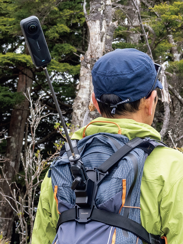 別売りアクセサリーの「三人称視点バックパックマウント」(¥9,190)を使うと、両手が離せない場所でも撮影が可能になる。クサリ場を登っている自分の姿など、他人に撮ってもらわないかぎり見ることはできないが、Insta360 X5なら簡単に臨場感たっぷりの映像を残すことができる。