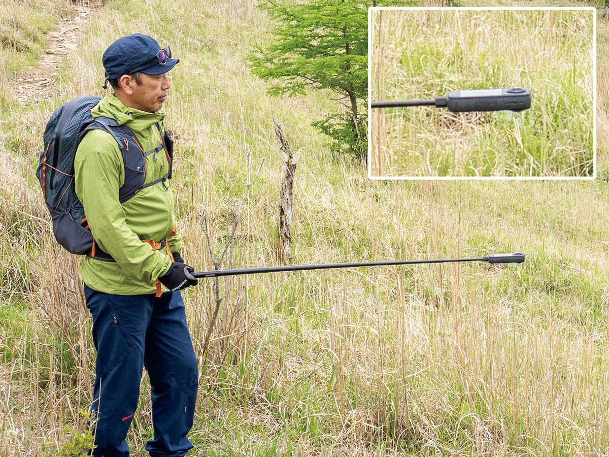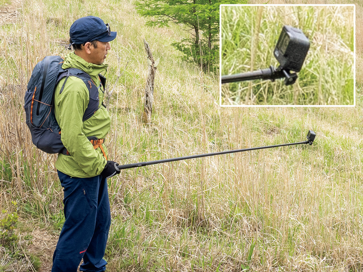 別売りオプションの「超長い自撮り棒」(¥8,000)は、その名のとおり長さ3m。これを使うと、まるで上空からドローンで撮ったような映像が撮影できる。山頂稜線などで使うと効果抜群で、空間に浮かんだような高度感ある映像が簡単に撮れてしまう。これまでの一般的なカメラではとうてい得られない撮影体験だ。