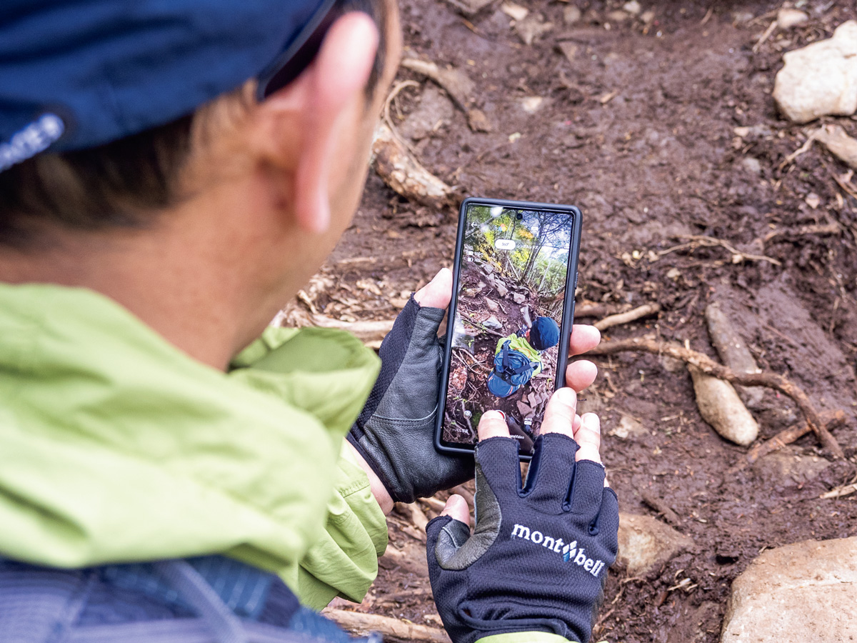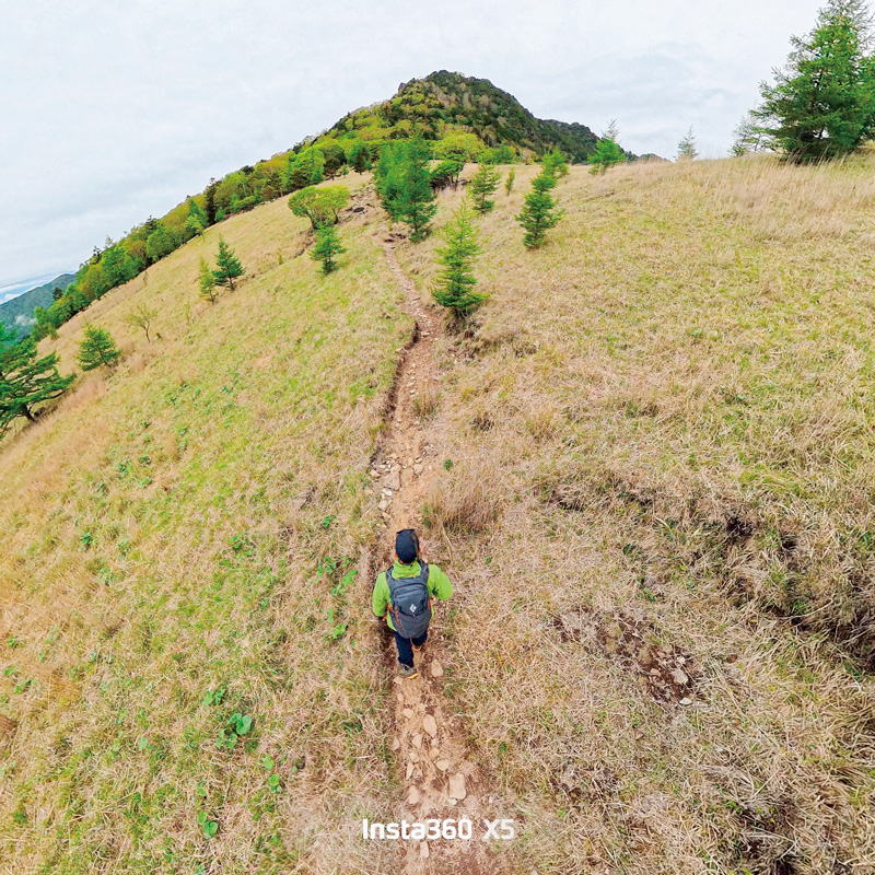 Insta360 X5を登山道脇に置き、その横を通りすぎるだけ。それをアプリで書き出せば、あら不思議、まるでカメラマンがパンしながら自分を追ってくれているような動画ができあがる。特殊なジンバルカメラでしか撮影できなかった動画が簡単に撮影できるのだ。