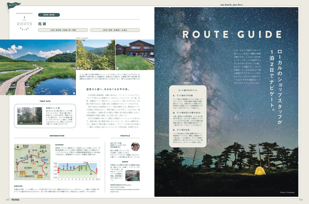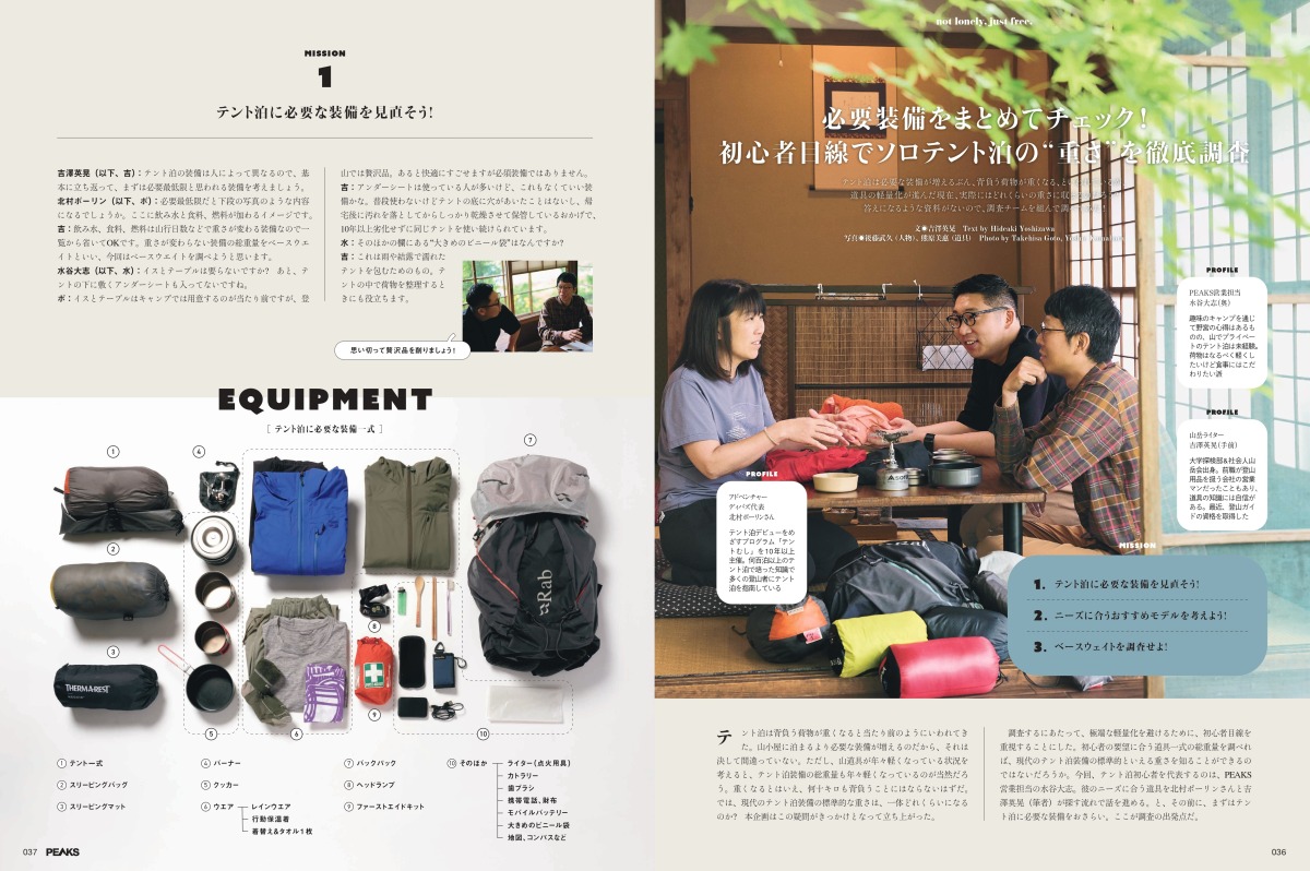 今号のPEAKSは、ワクワクと不安が交ざり合う、そんなソロテント泊のデビューに向けて知っておきたい情報を、たくさんパッキングしてお届け!