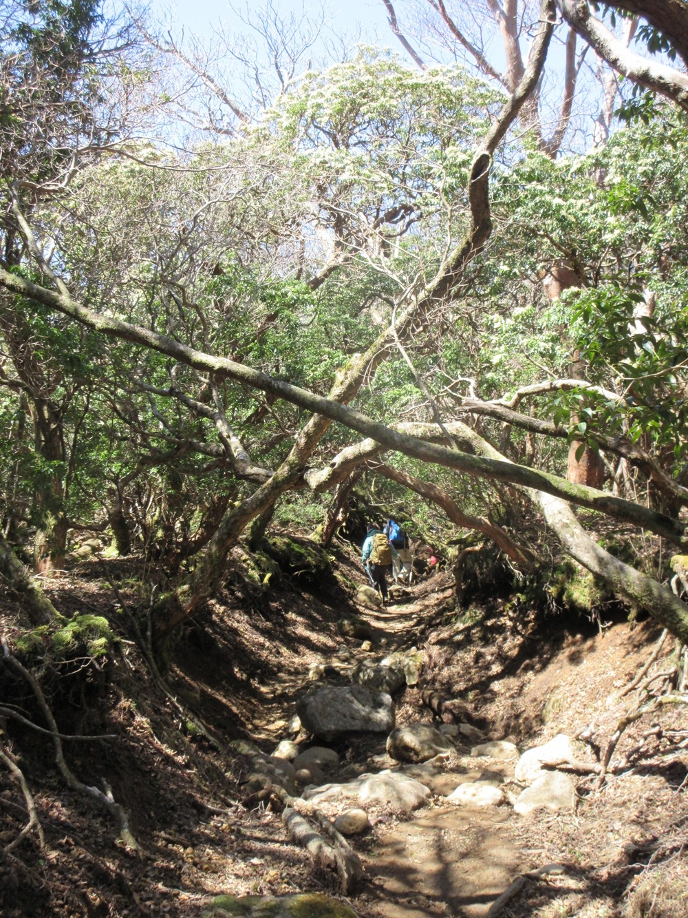 万二郎岳から先は、穏やかな鞍部、馬の背を進む。小ピークをひとつ越え、しばらくするとトンネル状のアセビの群落が現れる。天城山、春のハイライトスポットだ。見上げると、そこかしこで小さな花房がまるで大家族のように密集している。ほのぼのとした容姿にとても癒されるのだが、アセビには毒がある。馬が食べると酔った状態のようになって苦しむことから、漢字で書くと「馬酔木」。可憐な容姿からはまったく想像できず、自然界の不思議を感じる。