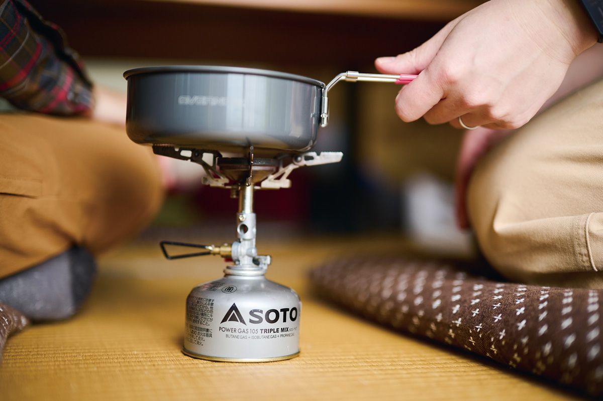 ポ:クッカーにはエバニューの製品がよさそう。小型のフライパン、炊飯用のアルミクッカー、軽量なチタンクッカーなどが揃っていて、すべて重ねられるのでコンパクトに持ち運べます。バーナーはSOTOの「マイクロレギュレーターストーブウインドマスター」がおすすめで、付属のゴトクとは別に4本ゴトクを選べます。