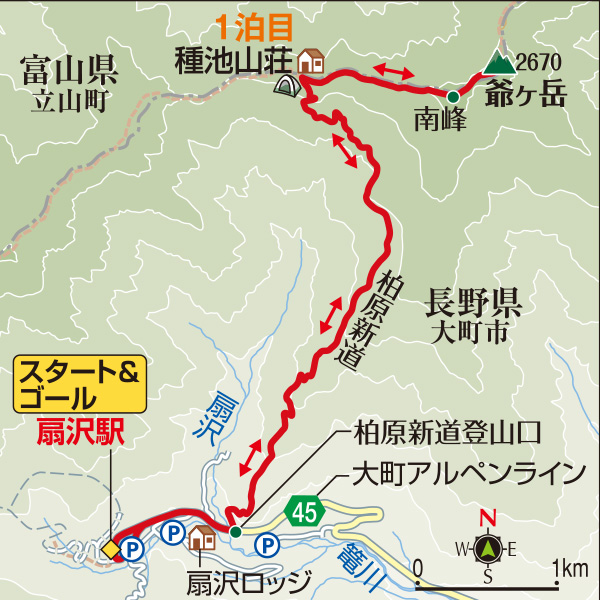 爺ヶ岳は南峰、中峰、北峰の3つのピークからなる山で、最高峰の中峰からは鹿島槍ヶ岳、立山、剱岳、針ノ木岳、蓮華岳まで見渡せる360度の大展望が魅力。登山道は明瞭で歩きやすく、途中には駅見岬や水平道など展望の良いポイントもある。種池山荘から先はチングルマなどの高山植物が咲き誇るポイントもある。種池山荘のテント場は樹木に囲まれていて眺望は期待できないので、ビールとピザは小屋前のテーブルで楽しもう。