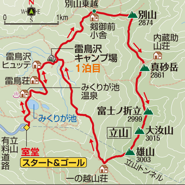 1日目は余裕のスケジュールでテント場での時間を満喫し、2日に立山三山周回、最後に温泉ですっきりしてから下山するルート。室堂から雷鳥沢キャンプ場までは1時間ほど。1日目は雷鳥沢ヒュッテの日帰り温泉を利用するのもいい。体力に不安がある場合は別山に進むのはやめて真砂岳に進み、大汝山、雄山、一の越、雷鳥沢ヒュッテへと周回しよう。逆回りもあり。天候や体力に合わせて臨機応変にルート変更しよう。
