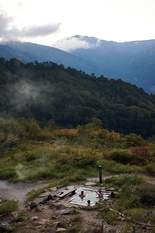 栂池自然園から白馬大池を経由して蓮華温泉へ下るルート。白馬大池山荘の周りはチングルマの群生地で最盛期は幻想的な雰囲気に。きれいな池のほとりで一泊したらいざ山中の温泉へ。「仙気ノ湯」まではなかなかの登り返しがあるが、がんばったかいのある絶景に出会える。山中にはほかにも「黄金湯」「薬師湯」「三国一ノ湯」があり、それぞれ開放的な空間で温泉を楽しめる。最上部の「薬師湯」は女性だけでの利用が可能。
