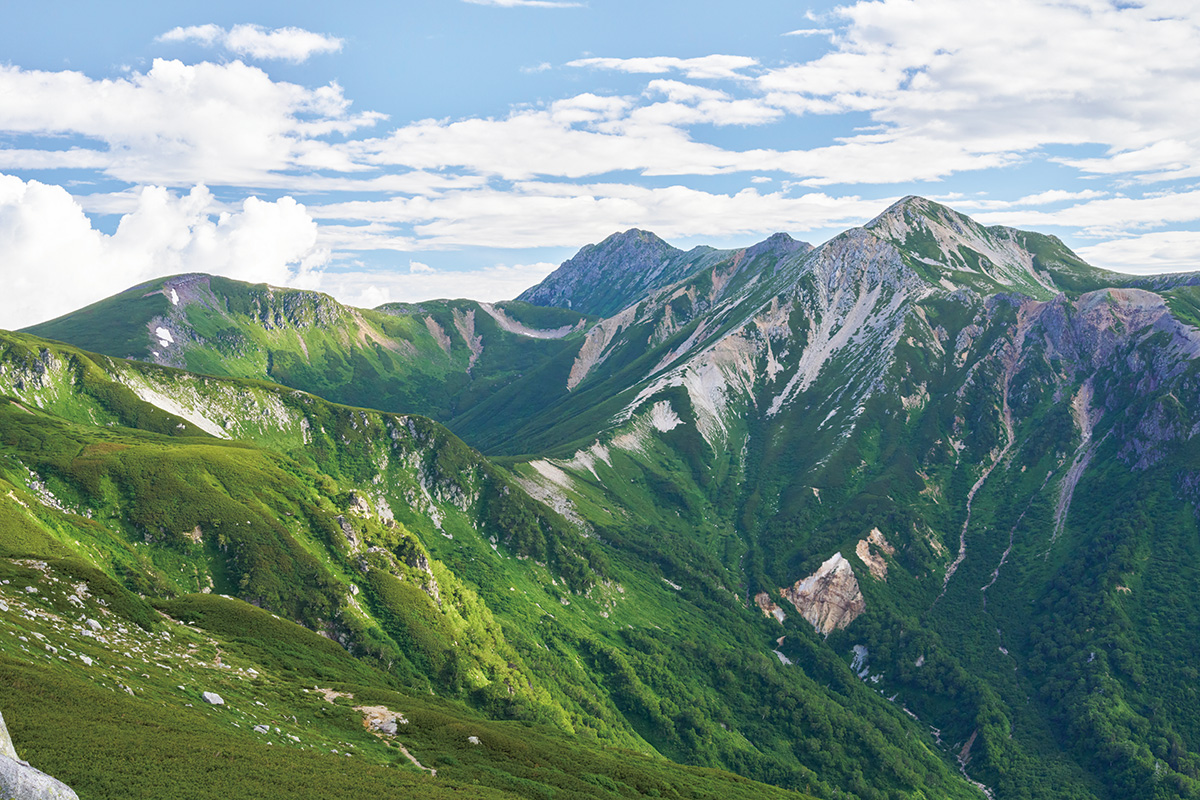 北アルプスでも屈指の高山植物の宝庫として知られる白馬岳周辺。グリーンシーズンになると多くの人でにぎわう。白馬岳を通るルートは白馬岳頂上山荘に宿泊して猿倉へ下る方法もあるが、雪渓(白馬大雪渓)歩きが必須になるので、テント泊ビギナーはピストンで栂池に戻るルートを選択しよう。