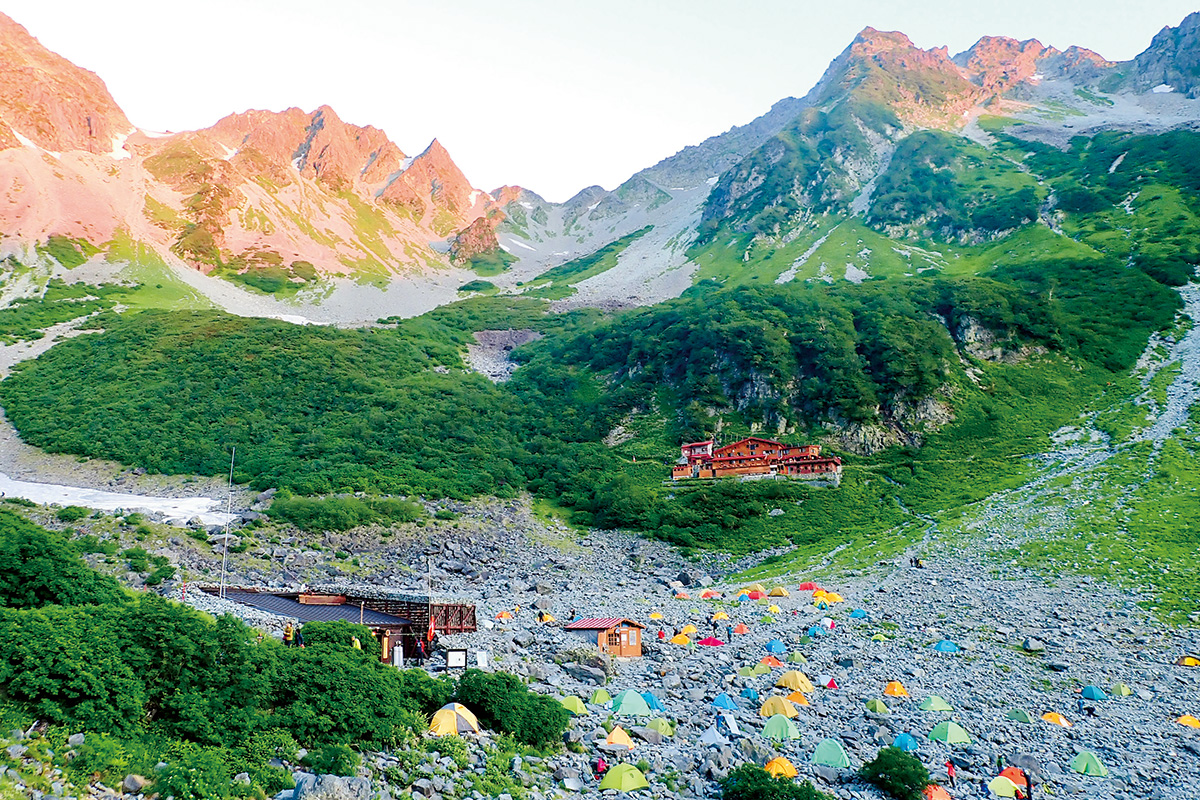 歩行時間も長い、標高差もなかなか、ピークを目指さないのに一度は行ってみたいという声が多い涸沢カール。氷河の侵食によって削り取られたお椀状の巨大な谷で、最大標高差約900mと規模は日本最大級。夜は満天の星空、早朝はモルゲンロートを拝むことができる最高のロケーション。写真撮影は必須だ。