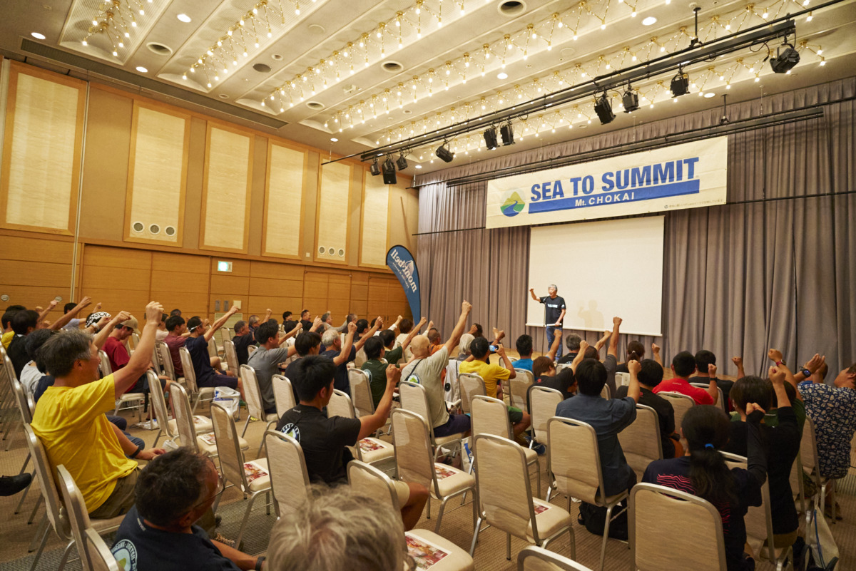 大会受付を済ませ、開会式会場の「鳥海温泉 湯楽里」へ。スタートから熱気に満ちていた。モンベルグループ代表・辰野勇さんによる気合の入った掛け声に合わせてこぶしを突き上げる参加者一同。一気に士気が高まる。イベントを作り上げる関係者と参加者による”シートゥーサミット愛”、そこから醸し出されるアットホームな空気が伝わってくる。開催13回目となる歴史ある大会だからこそなのかもしれないが、モンベル関係者や地域の人、地元の参加者や遠方から毎年のようにやってくる参加者など、それぞれがこの大会に思い入れがあるのだと感じる。またモンベルが今年50周年を迎え、記念すべき年を祝うべく、いつも以上に会場が華やいでいたのかもしれない。しかしながら、このイベントは開会式から参加してこそ十二分に楽しめるのだと思う。