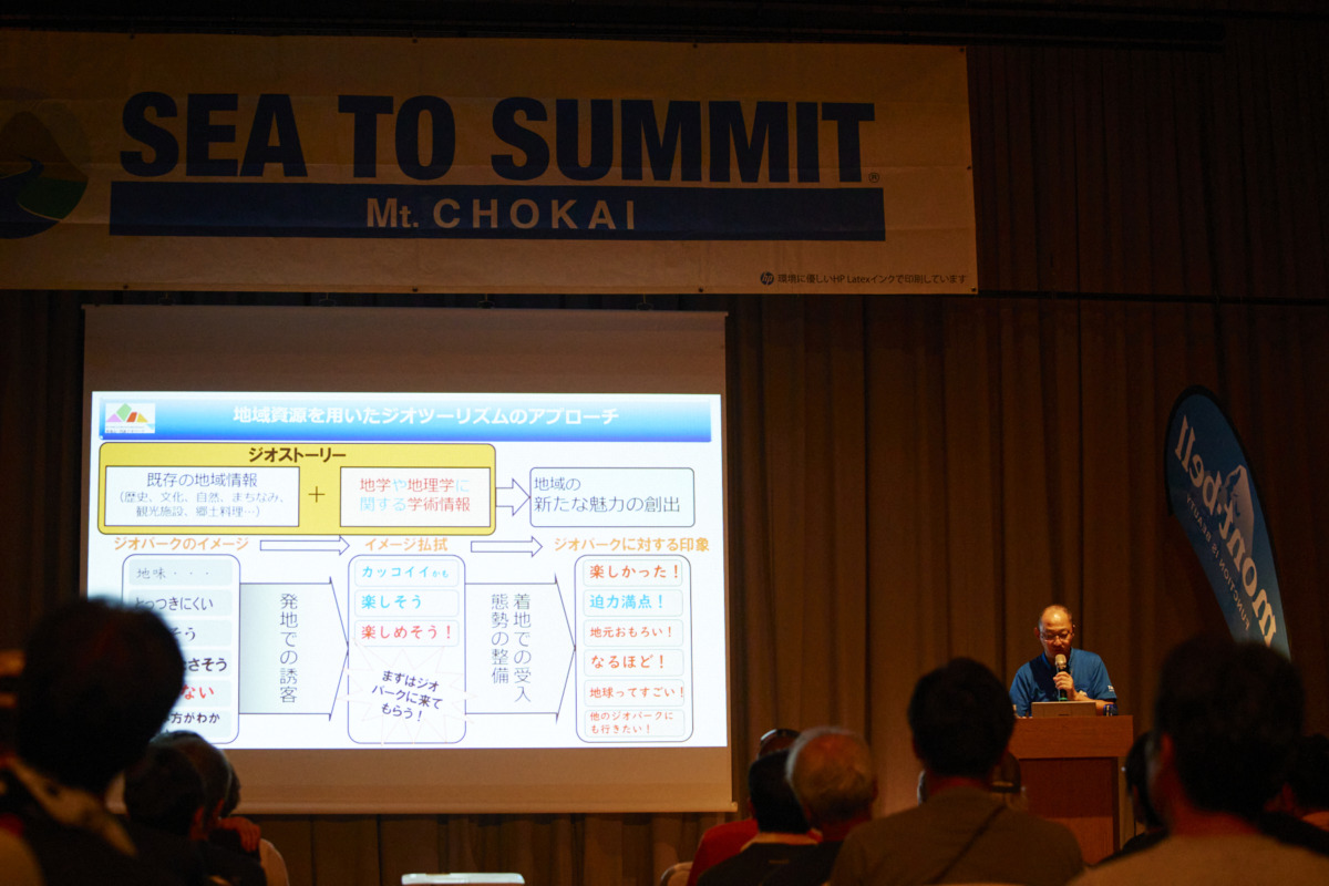開会式に続き、環境シンポジウムが開催された。テーマは「日本海と大地がつくる水と命の循環~鳥海山はジオパーク~」。講演してくれたのは大野希一さん。多くの火山噴火の調査研究に携わり、現在は鳥海山・