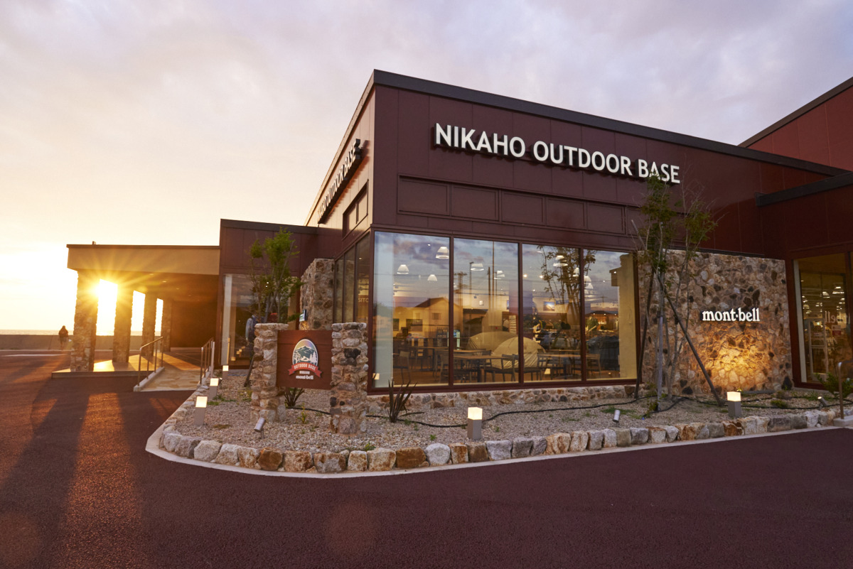 「NIKAHO OUTDOOR BASE」というアウトドア拠点施設のなかに昨年6月にオープンした真新しい店舗。2階建ての店内は広々としていて、なんとクライミングウォールまである。建物の外観もステキで、外観とともに海に沈む夕陽を眺めることができた。