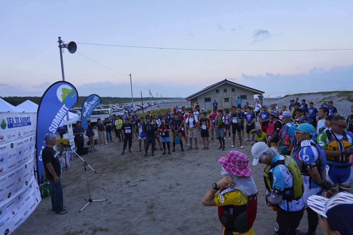 8月24日の朝5時。スタート地点である西浜海岸に集合し、スタート式が行なわれた。まずは辰野勇代表による勢いのある大会開始の挨拶から。眠気眼も一気に覚めて全身に緊張感と気合が駆けめぐる。