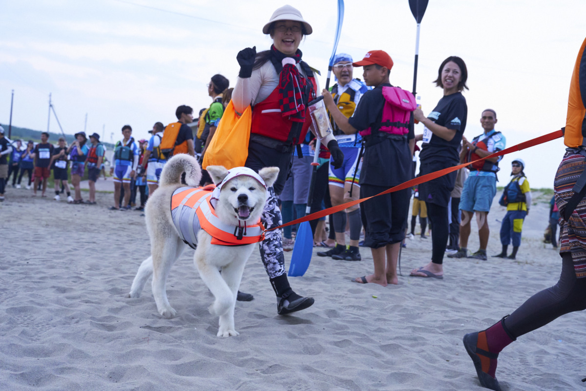そして、スタート! この大会はレースではないので順位を競わない。なので“走らない”が鉄則。呼ばれたチームから順番に出発し「海のステージ」へ。かわいらしく装備を整えた秋田犬くんも飼い主さんといっしょに参戦しているもよう。チームメンバーの人数に決まりもなく犬もOK。自由にアクティビティを楽しめるのが、この大会の魅力のひとつだ。