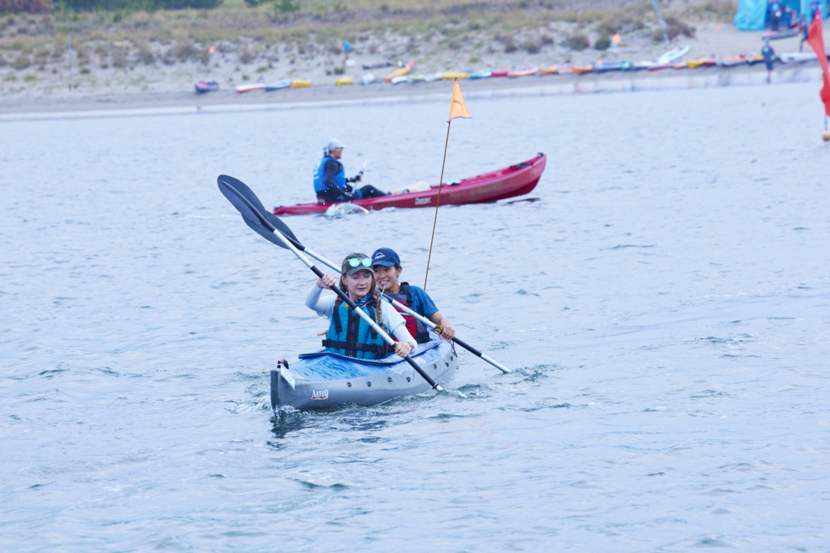なんと辰野代表自ら大会に参戦! あらゆるアクティビティアイテムを網羅するモンベルの代表者なだけあり、シーカヤックを漕ぐ姿にも貫禄がみられる。