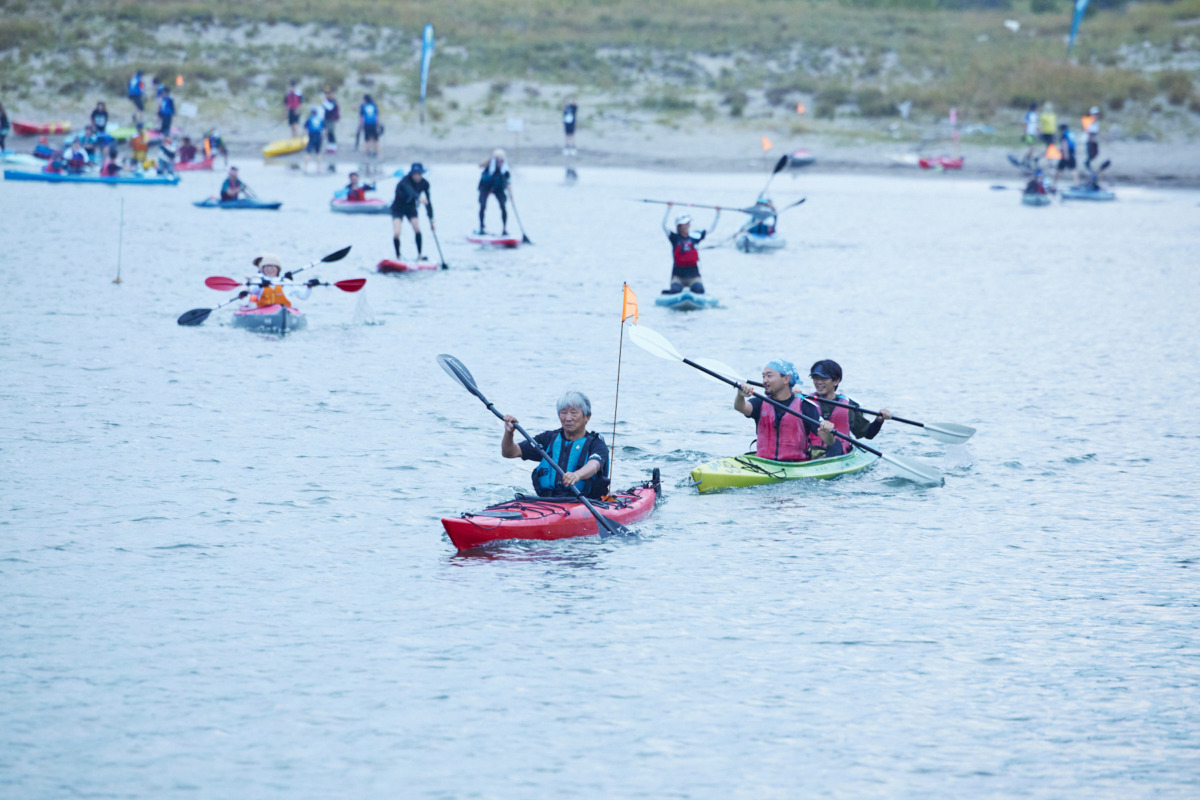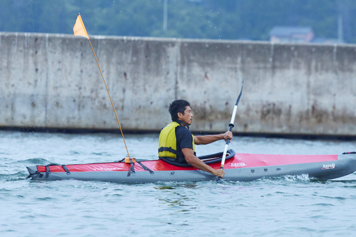 特別講演で登壇した角幡唯介さんもソロで参戦! 力強く漕ぐパドルフォームが美しい。さすが海から山まで、あらゆる環境を旅してきた極地旅行家だ。