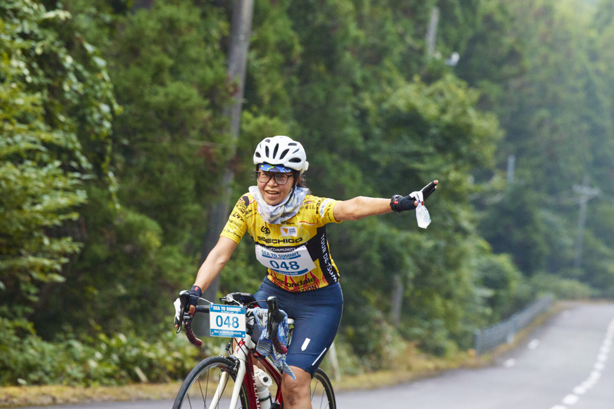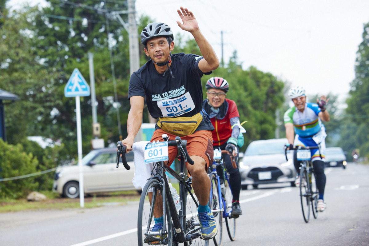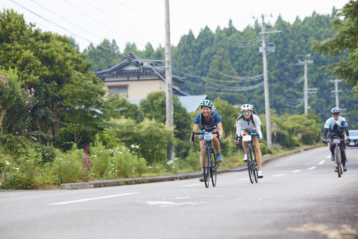 シーカヤックからロードバイクに乗り換えて「里のステージ」へ。このステージが今回もっとも長く、約21㎞もある。しかも、ほぼ登り坂だ。序盤は気持ちよく走り出し、いい笑顔をしているが、果たしていつまでもつのだろうか……。