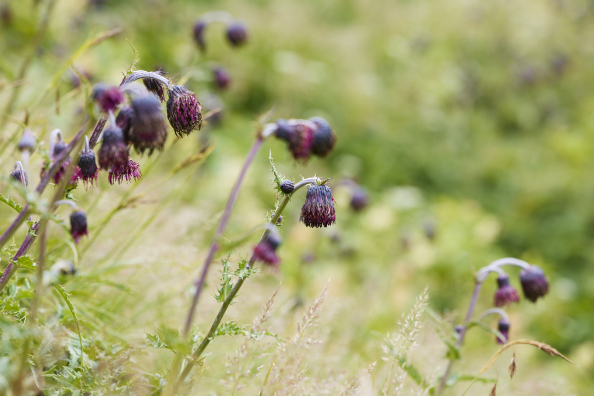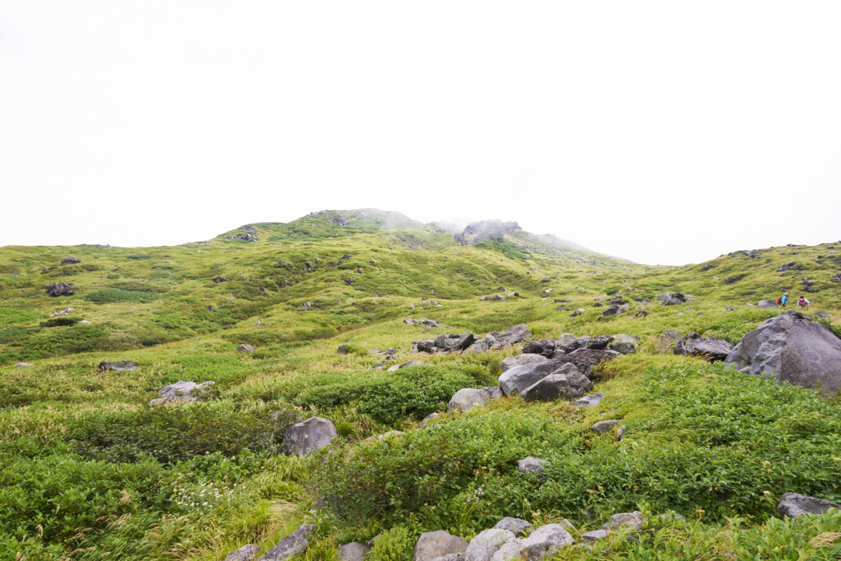 また登山道沿いにはチョウカイアザミがたくさん咲いていた。鳥海山特産の高山植物で、ここでしか見ることができない貴重な植物だ。一般的なアザミより赤色が強い紅紫色で、ぽってりとした頭を垂れ下げている。前日のシンポジウムで大野さんが教えてくれた鳥海山にしかない植物のひとつで、ぜひ見てみたいと思っていた。ほかにもチョウカイフスマなどの固有種も探したが、時期がズレているのか今回は見ることはかなわなかった。