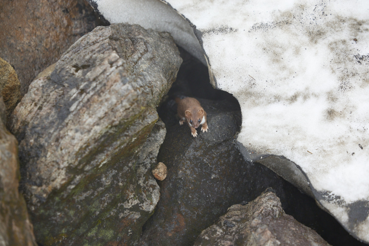 雪渓の隙間から顔を覗かせたのは、登山者のアイドル、オコジョ。好奇心旺盛な性格で、見つめる登山者に興味津々。雪渓から出たり入ったり、ちょろちょろと動き回りながら何度も姿を見せてくれた。