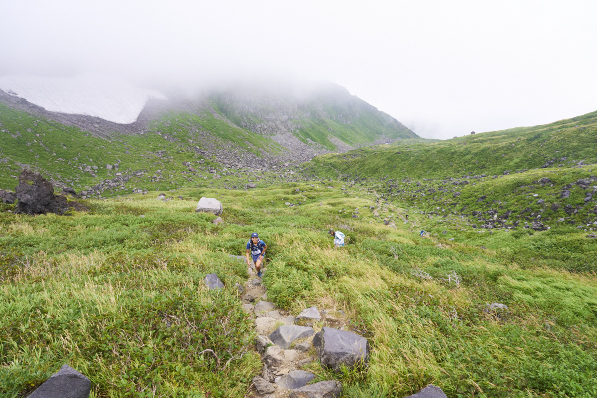 雄大な景色が広がる愛宕坂を下る。花の時期には登山道の両脇が花畑になる美しいスポットだ。今回はチングルマやウメバチソウなどの高山植物は終わりかけていてガスがかかっていたので少々残念ではあったが、石段が続く、とても気持ちのいいトレイルだ。