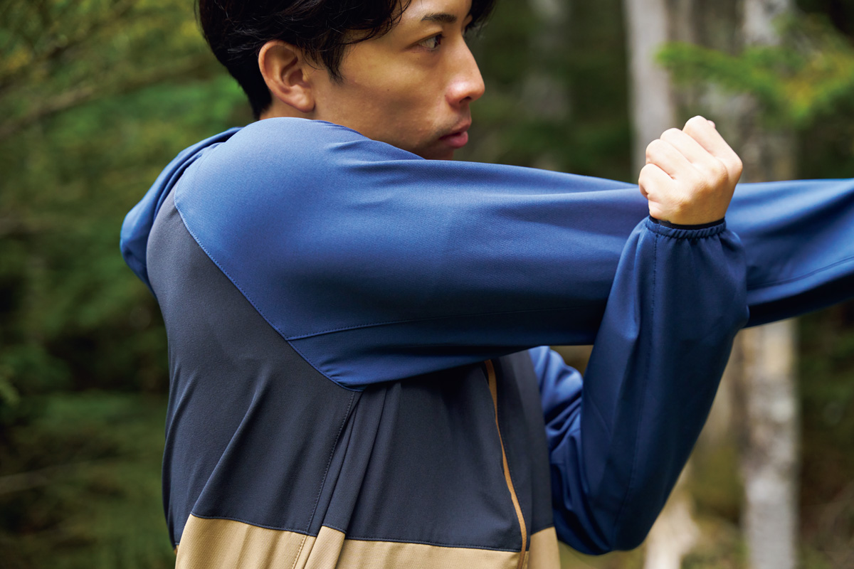 可動域が広いラグランスリーブと、ほどよく伸びる2wayストレッチの生地の合わせ技で肩周りの大きな動きもこのとおり。重ね着したときにもストレスなく動ける。