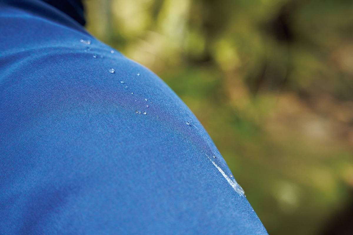 「レインウエアでいいんじゃない?」と思うかもしれないが、適度な通気性を備えているのがミソ。文字どおりソフトで軽やかにストレッチする生地は動きやすく、しかも蒸れにくい。レインウエアとは段違いの快適さだ。