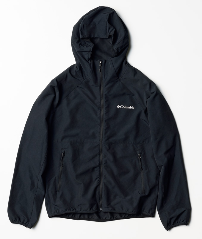 肌寒くなるこれからの季節を想定した適度な厚みのソフトシェルジャケット。フード周りと袖口、裾はシンプルなストレッチバインダー仕様で、ウエストにはファスナー付きポケットを備える。