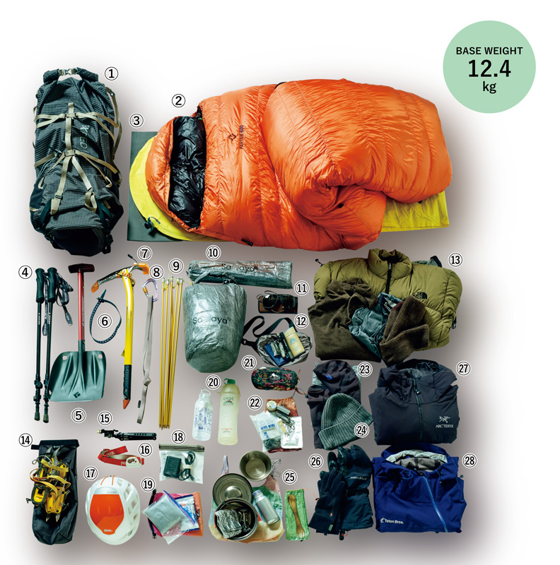 ①バックパック エクスペド/ライトニング45 ②寝袋キュムラス/パンヤム600 ③マット サーマレスト/ネオエアーXライト レギュラー、山と道/ミニマリストパッド ④ポール ローカスギア/カーボンファイバートレッキングポールCP3 ⑤ショベル ブラックダイヤモンド/トランスファー3 ⑥スキーバンド ⑦アックス グリベル/エアーテックEVO ⑧スリング ⑨スノーペグ イーストン/ゴールド24 ⑩テント サマヤ/サマヤ2.5 ⑪サングラス オンブラス/クラシック⑫サコッシュ ハイテールデザイン/ ウルトラライトファニーパック、財布、日焼け止めなど ⑬防寒ウエア ザ・ノース・フェイス/アコンカグアジャケット、2タックス×ムーンライトギア/ BAA#3 メリノフーディ軽エディション、スマートウール/クラシックオールシーズンメリノベースレイヤーボトム、ヤクウールソックス ⑭クランポン グリベル/エアーテックライトEVOオーマチック ⑮三脚 レオフォト/ MT03 ⑯ヘッドランプ ペツル/アクティックコア ⑰ヘルメット ペツル/シロッコ ⑱モバイルバッテリー ⑲トイレセット ⑳ボトル キントー/ランドネ×高山植物図鑑×キントー、クノック/ヴェシカ1ℓ ㉑メガネ ㉒エマージェンシーキット ㉓バラクラバ ファイントラック/メリノスピンバラクラバ ㉔ビーニー ㉕クッキングツール エバニュー/ Ti U.L.ポット1300+900、ニクツカム、SOTO /ウインドマスター+4本ゴトク、風防、熱燗用アルミボトル、ルー/スポーク、スノーピーク/チタンシェラカップ×2 ㉖グローブ モンベル/2in1アルパイントリガーフィンガーミトン、エクストリミティズ/フラックスグローブ ㉗中間着 アークテリクス/アトムLTフーディ ㉘シェル ティートンブロス/ツルギライトジャケット