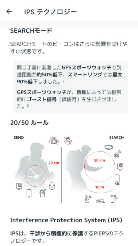 さらに雪崩についての解説ページや、捜索と救助の方法を解説している動画へのリンク(ドイツ語音声で字幕は英語)、さらにIPSテクノロジーに関する説明など、雪崩やビーコンについて学べるコンテンツも充実している。