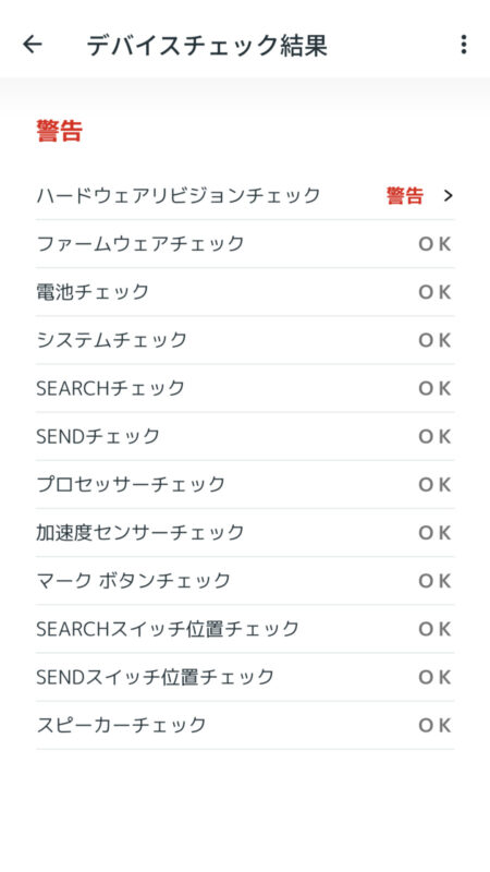 ビーコンのデバイスチェックでは、シグナルの送信や受信、各種センサー、電池などに問題がないかテストすることができるので、シーズンインの前にはかならず実施しておきたい(下の「ハードウェアリビジョンチェック」の警告は、テスト機でチェックしたために表示されているもの)。