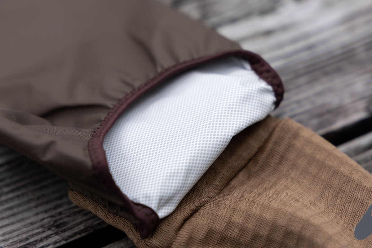 しかし、このミトンカバーは完全防水素材ではなく撥水素材。縫い目に防水テープが施されているわけではないので、強い雨に降られ続ければ浸水はある。レインウエアではなく、ウインドシェルだと考えれば、その用途は理解できるだろう。