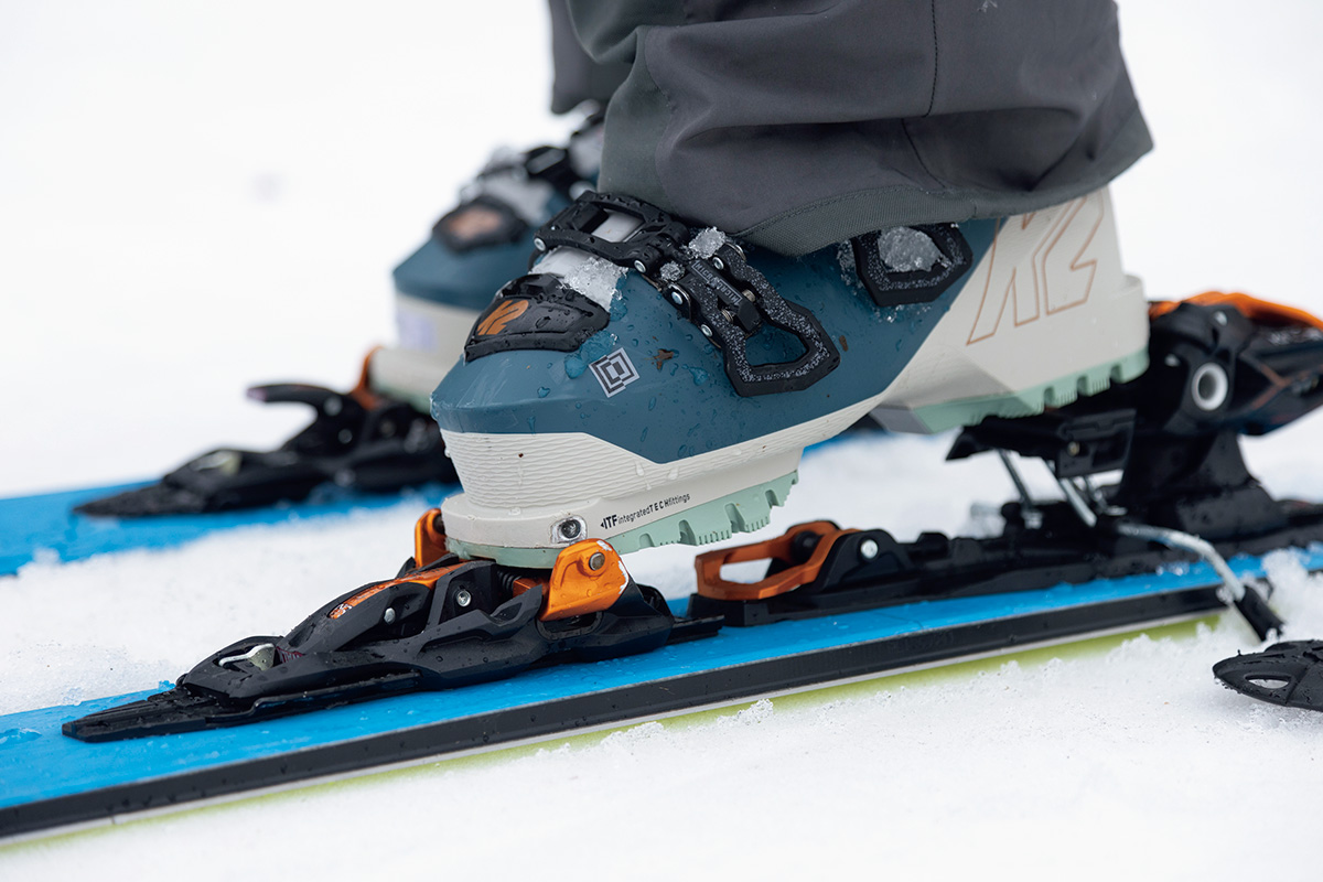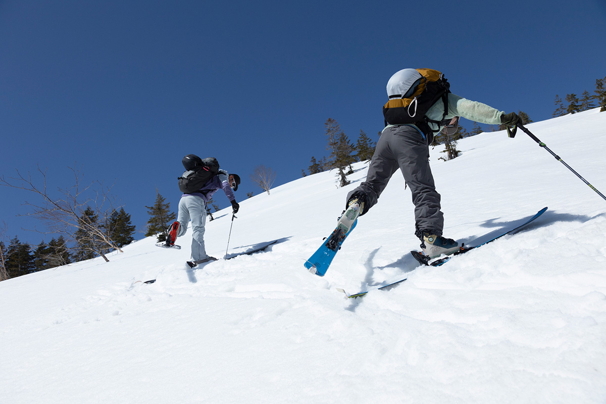 ビンディングは一時的につま先だけを固定できるテックビンディング、ブーツは足首を動かせる「ウォークモード付き」を選ぶことによって、スキーを履いたまま快適に登れる。滑走時は通常モードに切り替えて使う。