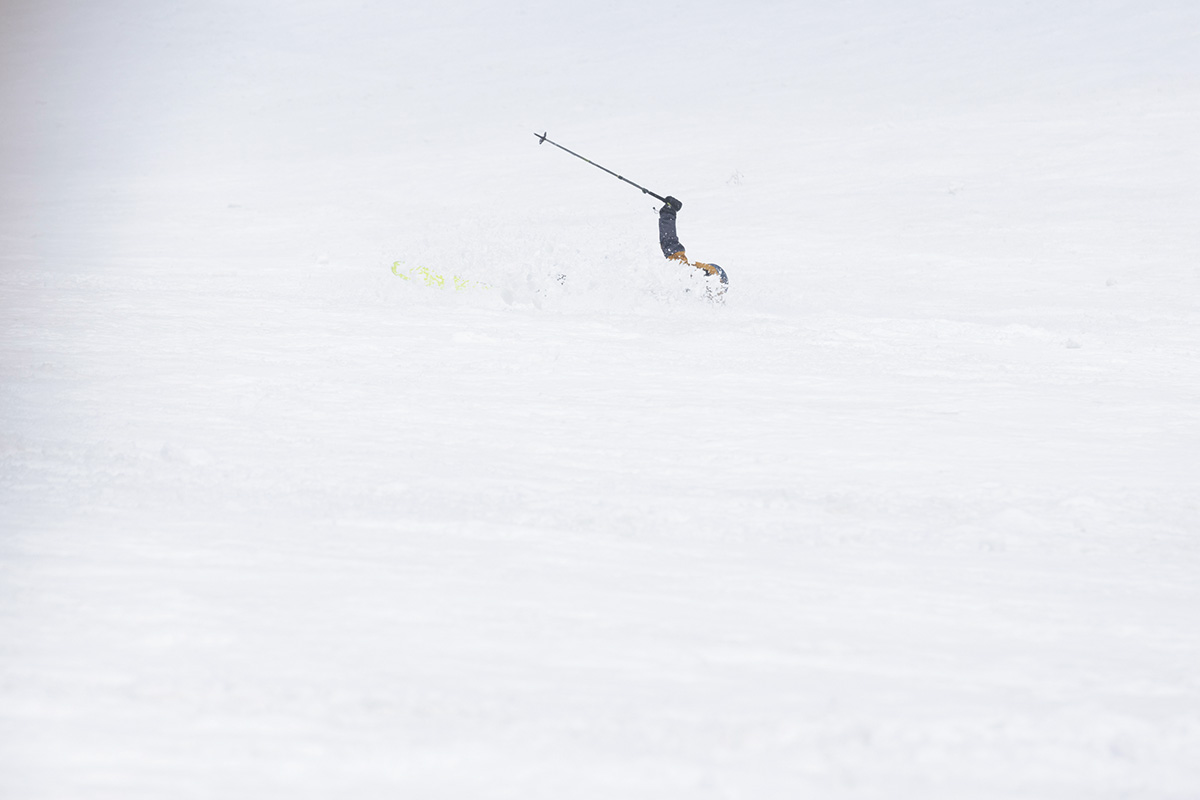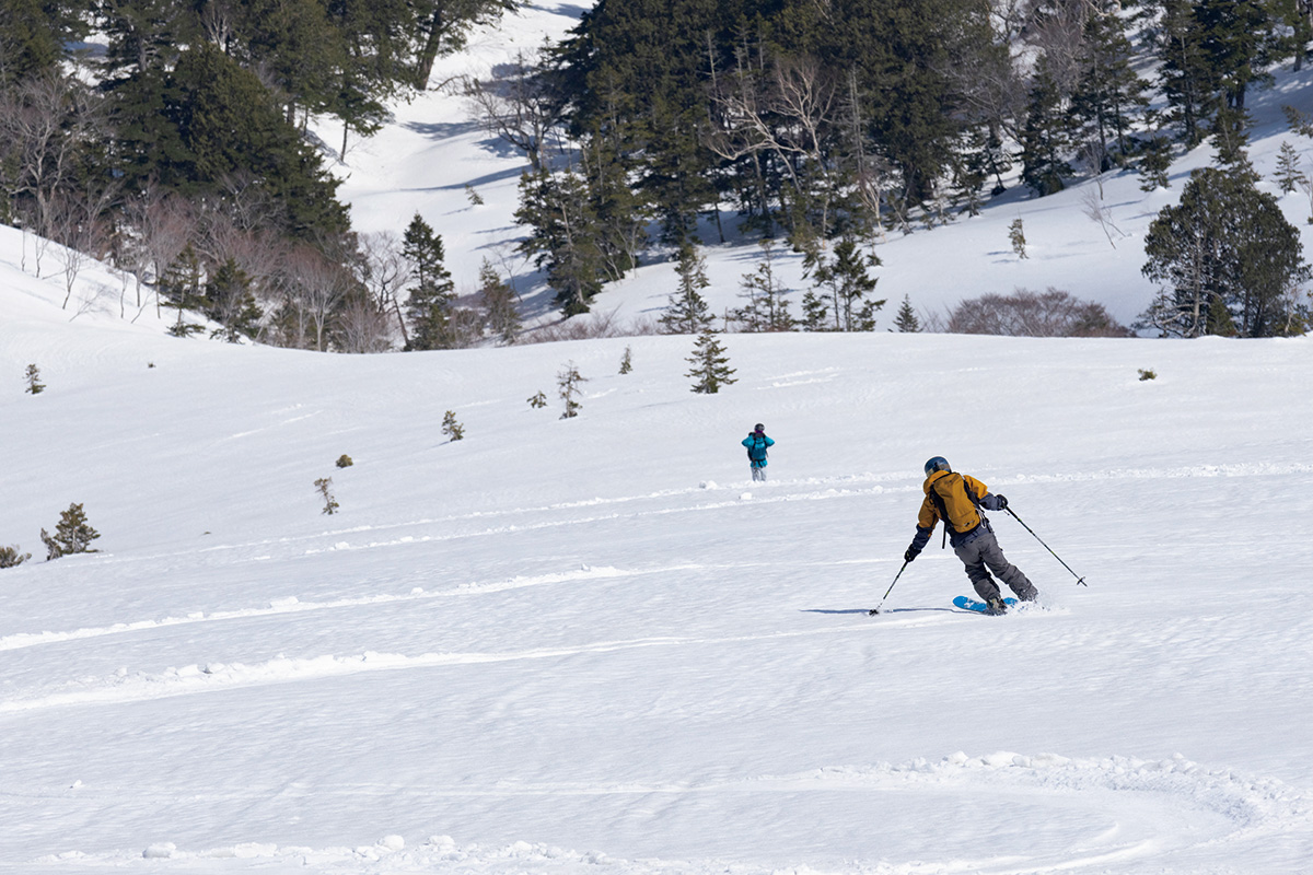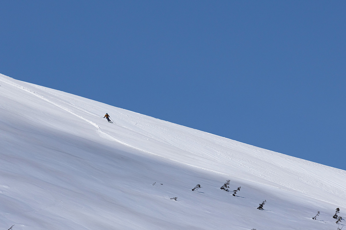 第一声は「どひゃー!」だ。いや、正直「ひっ!」と言ったまま声が出なかった。バーンが広すぎて速度感がおかしい。木や岩など目標物が少ないこともそのスピード感をあと押しする。滑り出し前は「後傾にならず、腕を下げず、きちんとストックを突くこと」とか、いろいろ考えていたんだけど、そんなものは全部ふっとんだ。無我夢中で数ターン繰り返すと、あっという間に長井ガイドが待つポイントだ。ゲレンデとはまったくの別モノ。息をするのも忘れるほどの没入感がある。