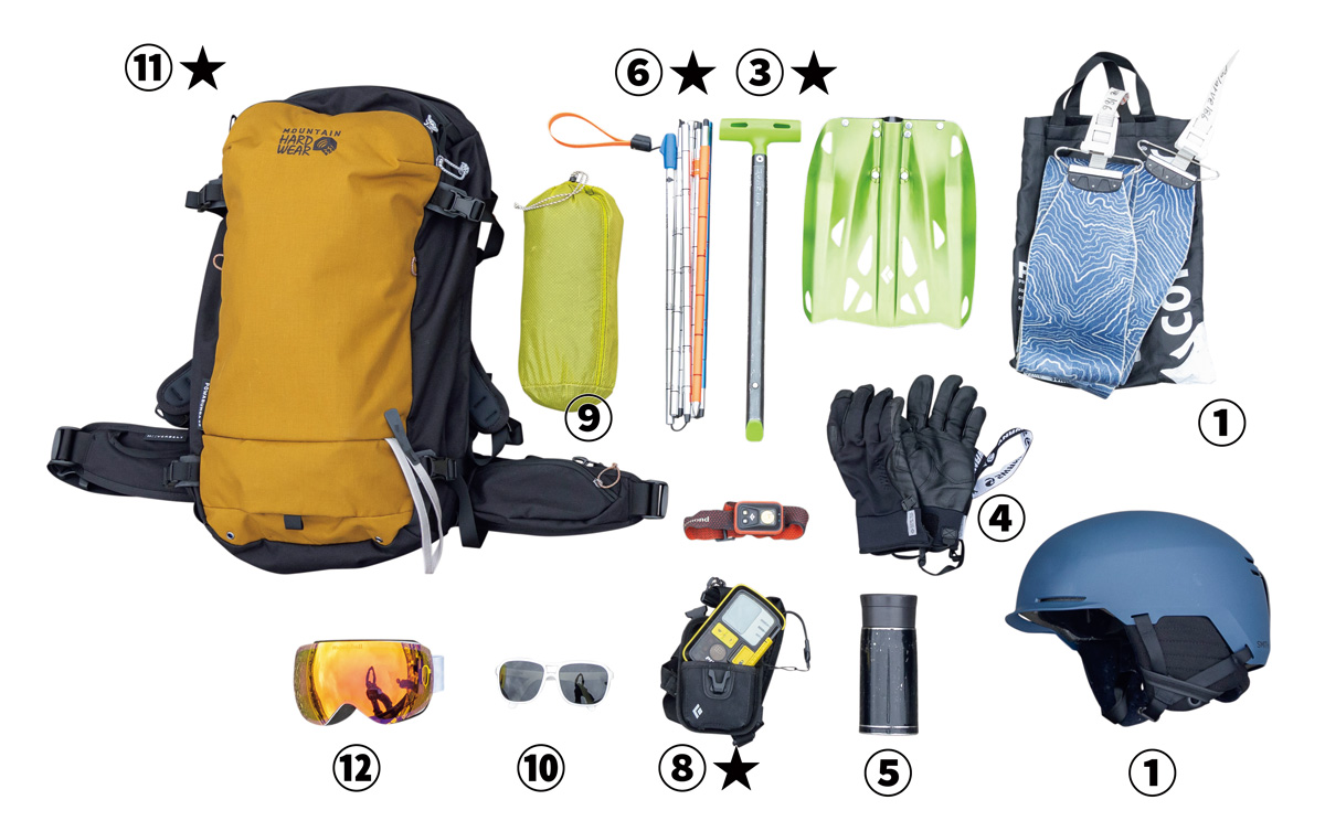 ①クライミングスキン(シール)。②ヘルメット。③ショベル:硬い雪も掘ることができる金属製を推奨。④滑走用グローブ:予備も持つこと。⑤保温ボトル:別途飲み水も必要。⑥プローブ:3m前後のもの。⑦ヘッドランプ:万一の日没後の行動やビバークに備える。⑧アバランチビーコン。⑨ダウンなどの防寒具:休憩時だけでなく、滑走時の視界回復待ちにも必須。⑩サングラス:偏光や調光機能のほかUVカット機能も必須。⑪バックパック:1Dayツアー参加の場合は25 ~ 30ℓほど。⑫ゴーグル:地形が判断しやすい偏光やハイコントラストタイプを。予備もかならず持つ