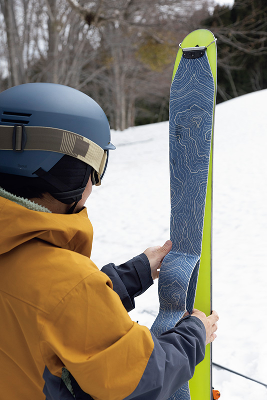 その秘密は「クライミングスキン(シール)」と呼ばれる毛の生えたシートにある。毛が斜面に対して逆向きに生えていて、板の裏に貼り付けることで登るときは雪を噛み、下ろうとする滑りを止めてくれる。シートの裏面の粘着剤(グルー)で板に密着させて使う。