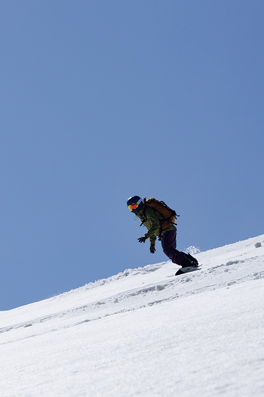 一枚の板で雪を捉えるスノーボードは浮力が高く、厳冬期の深雪に負けない自由な動きが快感。沢のような湾曲した地形を生かしたライン取りも得意で、自然地形を楽しく遊べるのも魅力だ。