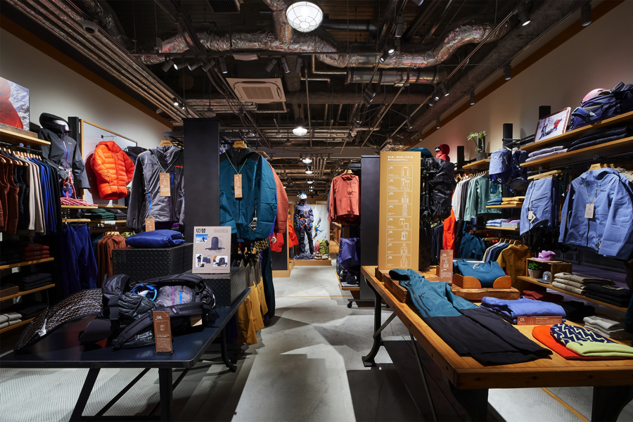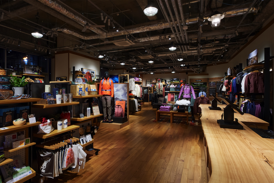 歴史ある札幌軟石や木材を活かした温かみのある空間デザイン。ニセコや大雪山系を思わせる本格的なテクニカルウエアから、街でも違和感なく着られるライフスタイルウエアまでつながるラインナップ。そして、日本初となるミシン常設のWorn Wearリペアコーナーと、フィールドを守るためのコミュニティハブ機能。