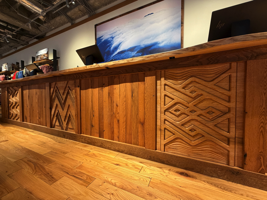 店内のビジュアルにも注目したい。北海道のほぼ中央にそびえるトムラウシを、店舗の精神的な中心に据え、そこから山・川・海へと繋がるゾーニングがなされている。