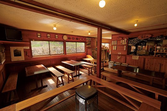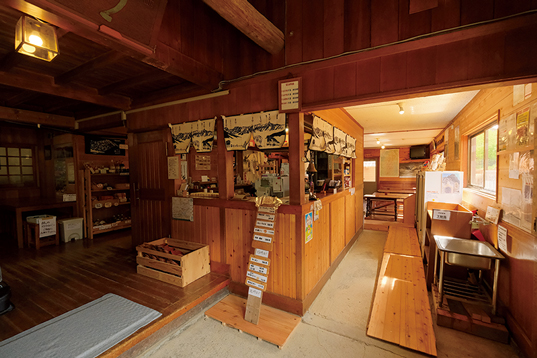 小屋に入ってすぐに受付と売店。右手にある蛇口から給水したり行動食やドリンクを買ったりとワンストップに利用可能。上履きと土足、どちらでも移動しやすい工夫もうれしい