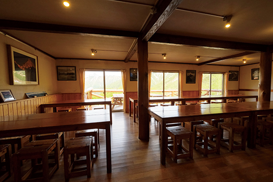 表に出れば小屋ごしに、またテラス席をはじめ館内からも槍・穂高ビューを堪能できる常念小屋のロケーション。日の出と日の入りの時間帯には、やはりひときわ目立つ槍ヶ岳が刻々と色味を変えてゆく。もちろん、日が高く昇った青空のもと明瞭に見わたす眺望も壮観なのだが、このなんともぜいたくな時間と空間を味わえるのは、宿泊者の特権だろう。