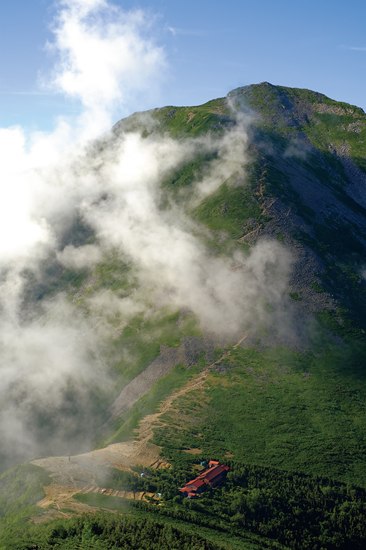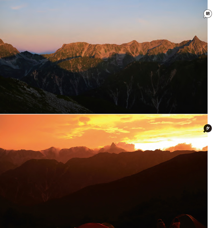 昇りはじめの斜光が、常念岳の影を槍・穂高に投影する“影常念”の朝。西空の夕焼けをバックに、槍ヶ岳が雲に巻かれながらとうとう沈んでいく夕。眼福な景色に見惚れるひとときだ。