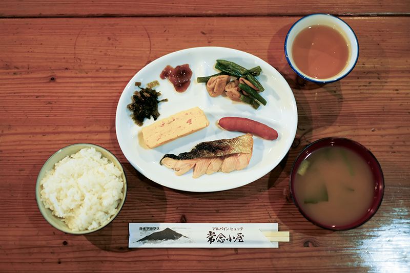 【朝食】小屋の外で日の出を見る宿泊者も多いため、時期により変動するが5時半ごろからの入れ替え制。メインには鮭、卵焼き、ソーセージが乗り、サイドには漬物や煮物が添えられる