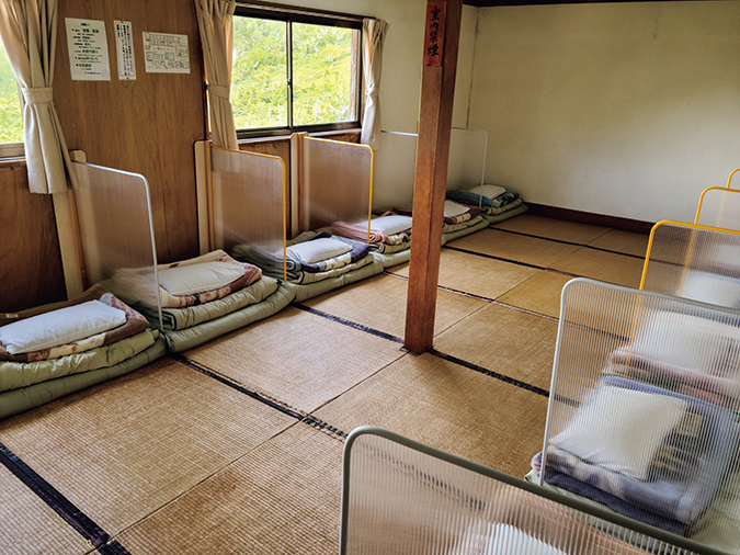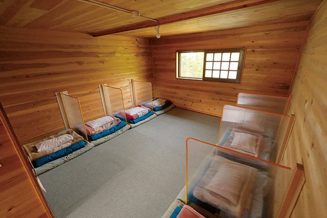 宿泊部屋は本館と別館にあり、大部屋が基本。6~16畳ほどで、パーテーションによって等間隔に仕切られている。個室の提供はなく、その日の状況に応じて部屋を割り振ってもらう。見通しのいい窓外の景色もお楽しみ