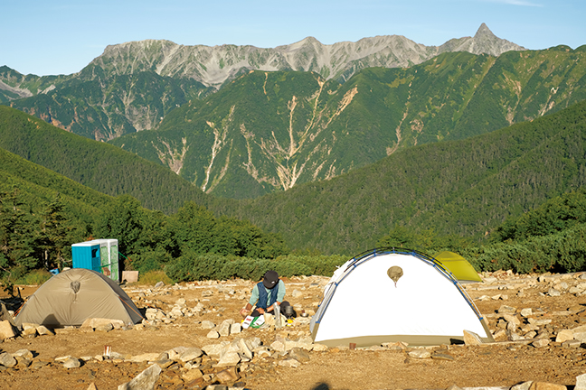 予約不要。大小合わせて2カ所のテントサイトが小屋の東隣に。ガレた土質の緩傾斜だが、段々に切られているので地面は平らで設営しやすい。まわりはハイマツ帯。夕焼けや、朝一番の槍ヶ岳。絶好の立地から山岳眺望を楽しんで!