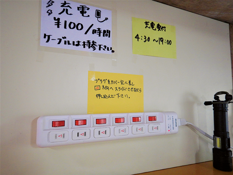 1時間100円で携帯電話を充電できるコーナーが食堂内にある。数に限りがあるので混雑時はひとり20分まで。なるべく自身のポータブルバッテリーで賄おう。