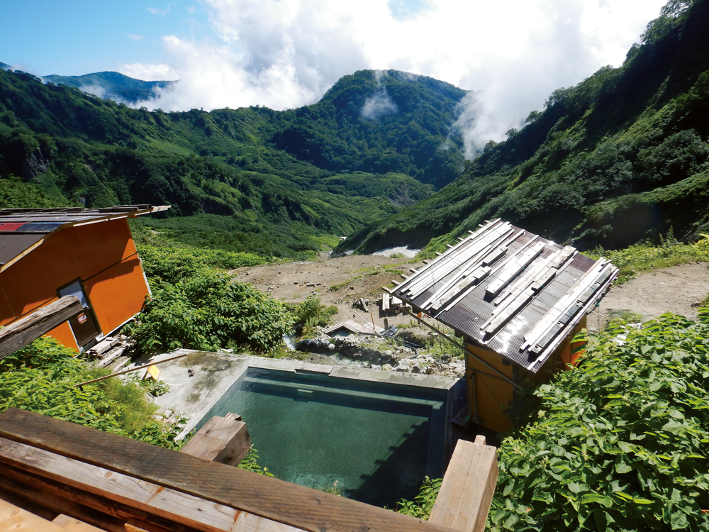 小屋の大きな特徴は標高2,100mに湧く温泉だが、数年前に露天風呂の浴槽の床に穴が空き、お湯が流出し登山道下に空洞ができてしまった。そのためしばらく休業し、浴槽に鉄骨を入れる工事を行ない営業を再開したのが2022年だ。見た目としては変わりないが、パワーアップした温泉を楽しめるはずだ。